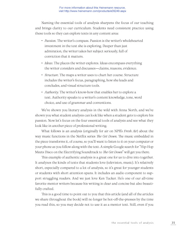 Explore the teaching of analytical writing from a new perspective.  In this groundbreaking book, Allison Marchetti and Rebekah O'Dell redefine "text" and offer practical lessons that help students discover analysis "in the wild," and use high-interest mentor texts to write their own analysis on topics that matter to them.