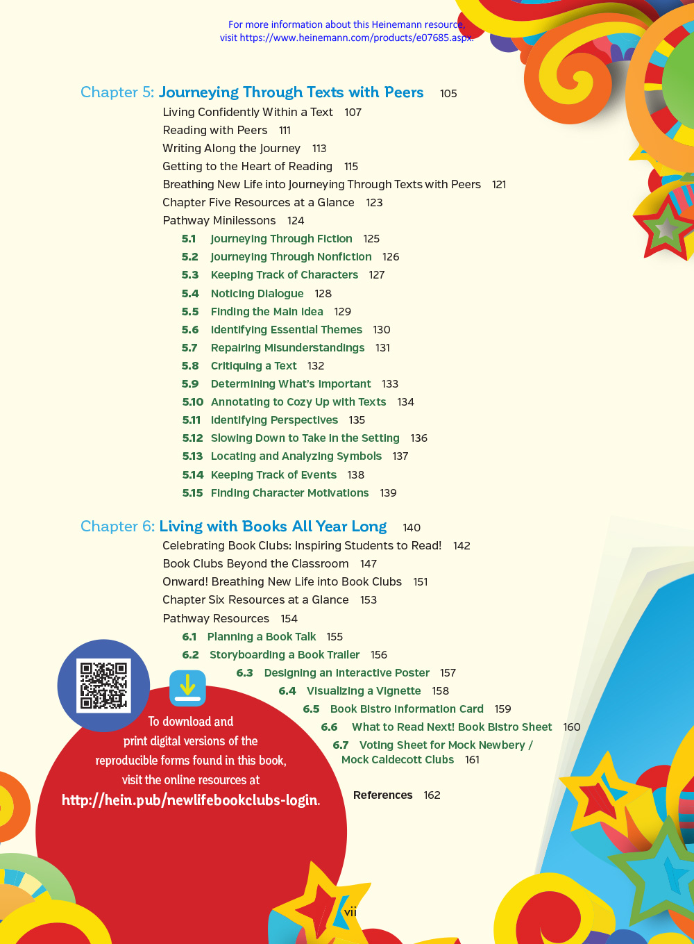 • Suggested “book bins” for book club work, organized by grade level and genre.