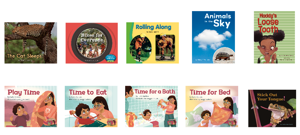 • 10 original titles (6 copies of each title) at text level D on the F&P Text Level Gradient™: The Cat Sleeps; Bikes for Everyone; Rolling Along; Animals in the Sky; Maddy's Loose Tooth; Play Time; Time to Eat; Time for a Bath; Time for Bed; Stick Out Your Tongue!