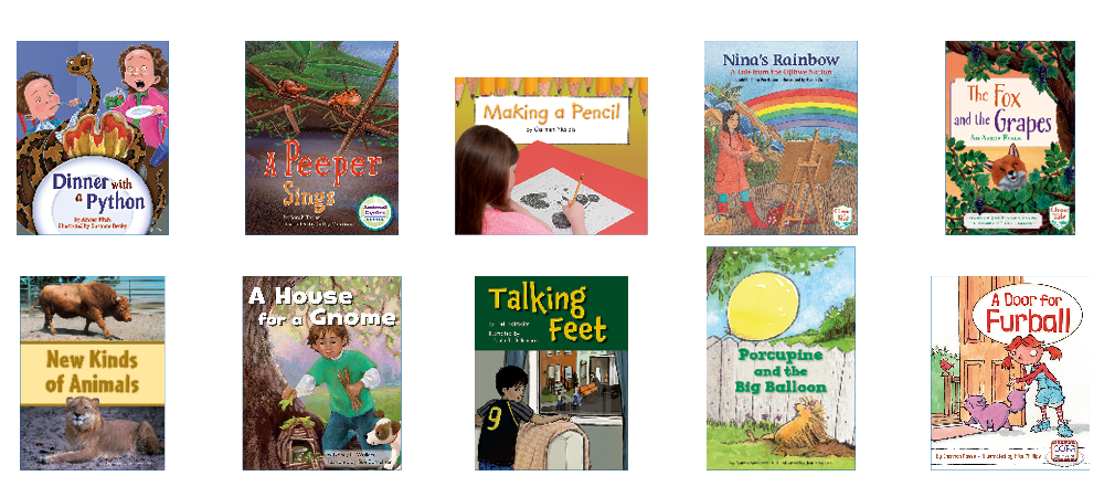 • 10 original titles (6 copies of each title) at text level I on the F&P Text Level Gradient™: Dinner with a Python; A Peeper Sings; Making a Pencil; Nina's Rainbow: A Tale from the Ojibwe Nation; The Fox and the Grapes; New Kinds of Animals; A House for a Gnome; Talking Feet; Porcupine and the Big Balloon; A Door for Furball