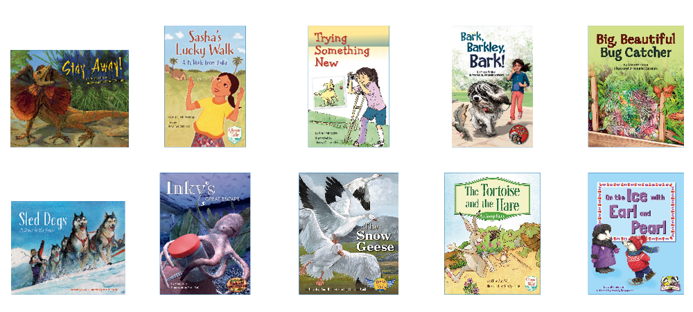 • 10 original titles (6 copies of each title) at text level J on the F&P Text Level Gradient™: Stay Away!; Sasha's Lucky Walk: A Folktale from India; Trying Something New; Bark, Barkley, Bark!; Big, Beautiful Bug Catcher; Sled Dogs: A Race in the Snow; Inky's Great Escape; The Snow Geese; The Tortoise and the Hare: An Aesop Fable; On the Ice with Earl and Pearl