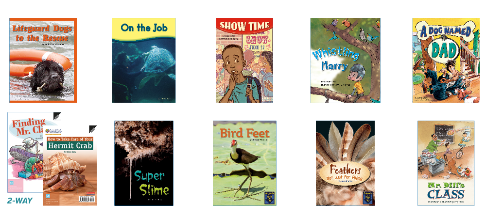 • 10 original titles (6 copies of each title) at text level M on the F&P Text Level Gradient™: Lifeguard Dogs to the Rescue; On the Job; Show Time; Whistling Harry; A Dog Named Dad; How to Take Care of Your Hermit Crab / Finding Mr. Claws (two-way book); Super Slime; Bird Feet; Feathers: Not Just for Flying; Mr. Dill's Class