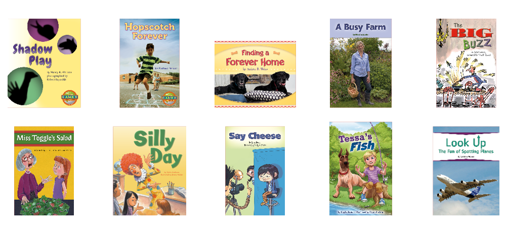 • 10 original titles (6 copies of each title) at text level L on the F&P Text Level Gradient™: Shadow Play; Hopscotch Forever; Finding a Forever Home; A Busy Farm; The Big Buzz; Miss Toggle's Salad; Silly Day; Say Cheese; Tessa's Fish; Look Up: The Fun of Spotting Planes