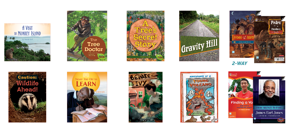 • 10 original titles (6 copies of each title) at text level R on the F&P Text Level Gradient™: A Visit to Monkey Island; The Tree Doctor; A Tree's Secret Story; Gravity Hill; Pedro and the Thieves: A Tale from Mexico / Pedro and the Peddlers: A Tale from Mexico (two-way book); Caution: Wildlife Ahead!; Never Too Old to Learn; Beware — Ivy; Adventures of a Young Volcano; From Silence to Fame: James Earl Jones / Finding a Voice: One Boy's Stuttering Story (two-way book)