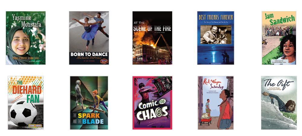 • 10 original titles (6 copies of each title) at text level W on the F&P Text Level Gradient™: Yasmine Moustafa: Young Scientist, Rising Star; Born to Dance: Michaela DePrince; At the Scene of the Fire; Best Friends Forever: The Story of Lee Duncan and Rin Tin Tin; Jam Sandwich; The Diehard Fan; The Spark and the Blade; Comic of Chaos; Red-Wagon Saturday; The Gift
