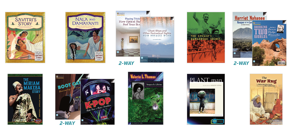 • 10 original titles (6 copies of each title) at text level Y on the F&P Text Level Gradient™: Savitri’s Story; Nala and Damayanti; Ghost Ships and Other Fantastical Sights: How Mirages Work / Playing Tricks: How Optical Illusions Fool Your Brain (two-way book); The Cyclist's Dangerous Secret; Harriet Nahanee: Keeper of the Land / Bridging Two Worlds: The Story of Annie Dodge Wauneka (two-way book); Empress of African Song: The Miriam Makeba Story; K-Pop: More than a Music Sensation / Boot Camp: Becoming a K-Pop Star (two-way book); Valerie L. Thomas: Images of a Lifetime; Plant Man: The Life and Art of Makoto Azuma; The War Rug