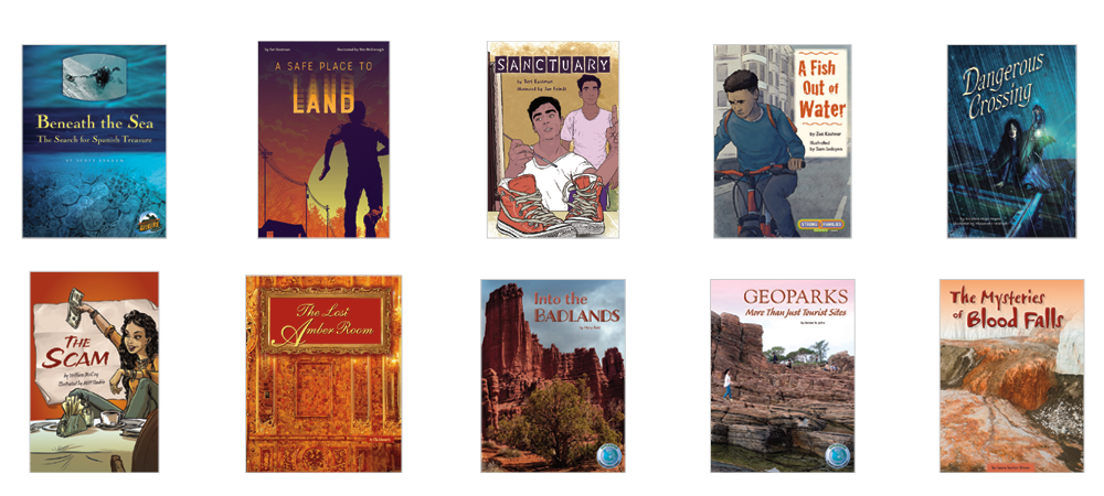 • 10 original titles (6 copies of each title) at text level Y on the F&P Text Level Gradient™: Beneath the Sea: The Search for Spanish Treasure; A Safe Place to Land; Sanctuary; A Fish Out of Water; Dangerous Crossing; The Scam; The Lost Amber Room; Into the Badlands; Geoparks: More Than Just Tourist Sites; The Mysteries of Blood Falls