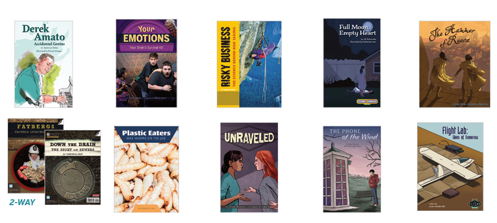 • 10 original titles (6 copies of each title) at text level Y on the F&P Text Level Gradient™: Derek Amato: Accidental Genius; Your Emotions: Your Brain's Survival Kit; Risky Business: The Science Behind Risk Taking; Full Moon, Empty Heart; The Hammer of Reeca; Fatbergs: Trouble Lurking Below / Down the Drain: The Story of Sewers (two-way book); Plastic Eaters: Wax Worms on the Job; Unraveled; The Phone of the Wind; Flight Lab: Skies of Tomorrow
