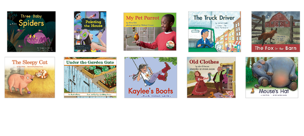 • 10 original titles (6 copies of each title) at text level C on the F&P Text Level Gradient™: Three Baby Spiders; Painting the House; My Pet Parrot; The Truck Driver; The Fox in the Barn; The Sleepy Cat; Under the Garden Gate; Kaylee's Boots; Old Clothes; Mouse's Hat
