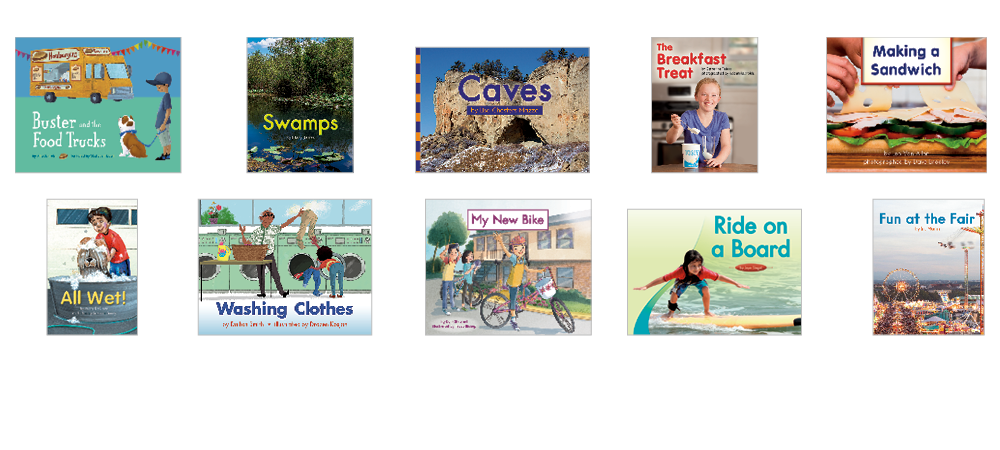 • 10 original titles (6 copies of each title) at text level C on the F&P Text Level Gradient™: Buster and the Food Trucks; Swamps; Caves; The Breakfast Treat; Making a Sandwich; All Wet!; Washing Clothes; My New Bike; Ride on a Board; Fun at the Fair