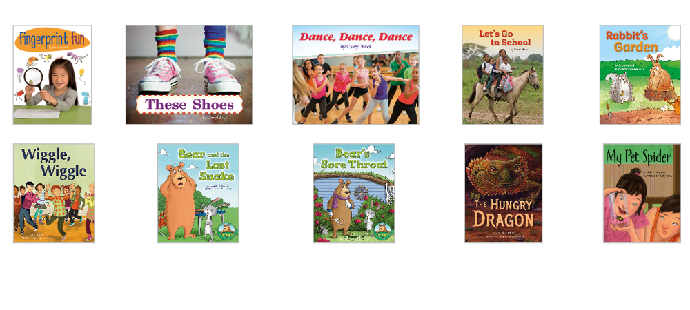 • 10 original titles (6 copies of each title) at text level H on the F&P Text Level Gradient™: Fingerprint Fun; These Shoes; Dance, Dance, Dance; Let's Go to School; Rabbit's Garden; Wiggle, Wiggle; Bear and the Lost Snake; Bear's Sore Throat; The Hungry Dragon; My Pet Spider