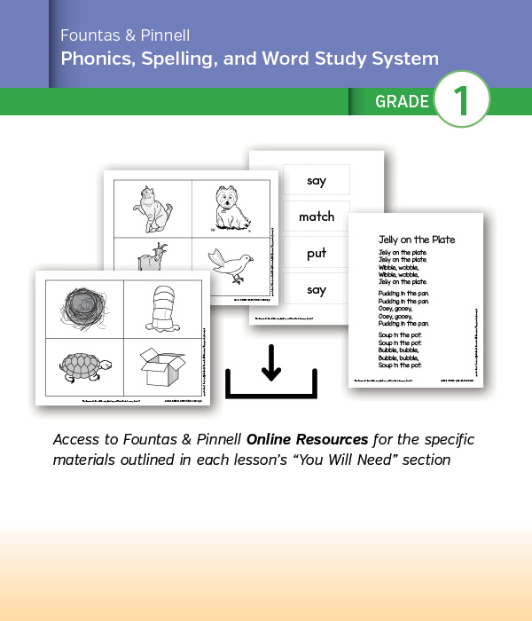 - Ready Resources – Ready-to-use, pre-printed materials for Phonics, Spelling, and Word Study Lessons. Ready Resources in Grade 1 includes items such as word lists, posters, categorized, general pocket-chart cards for tailoring lessons, lesson-specific pocket-chart cards, and blank, dry-erase pocket-chart cards. All Ready Resources items can be found in the Ready Resources shipper box.