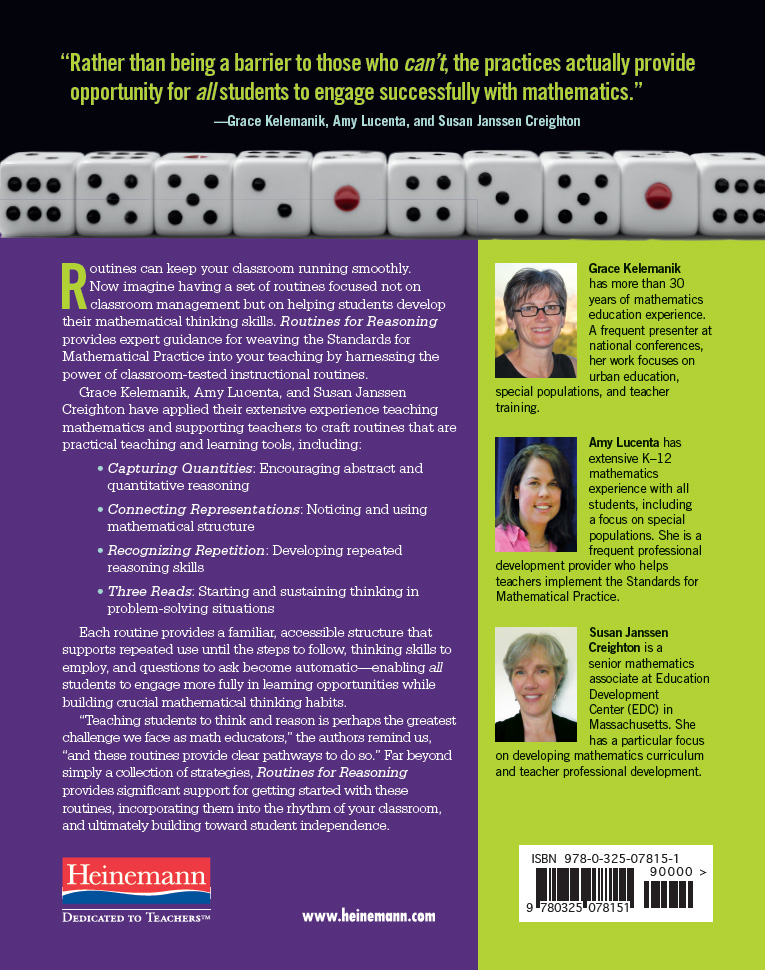 Grace Kelemanik, Amy Lucenta, and Susan Janssen Creighton have applied their extensive experience teaching mathematics and supporting teachers to crafting routines that are practical teaching and learning tools, including: