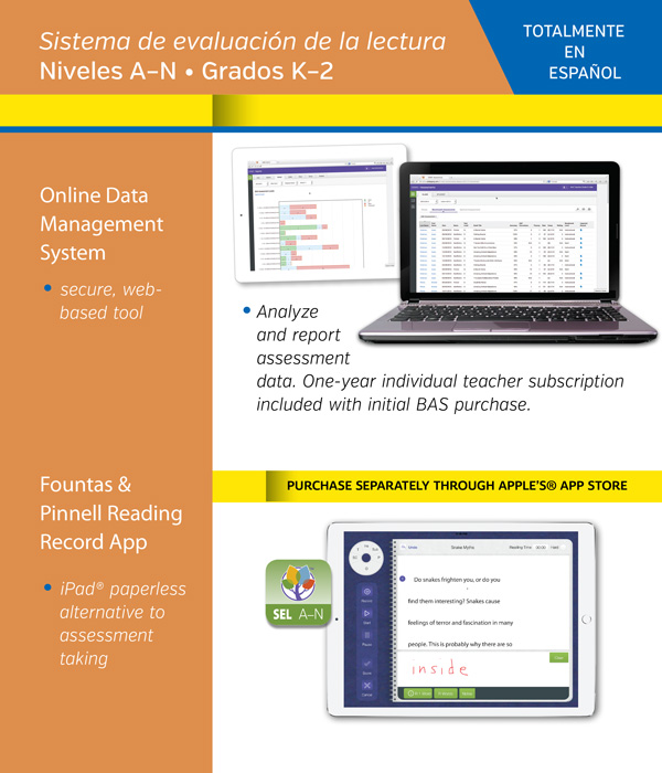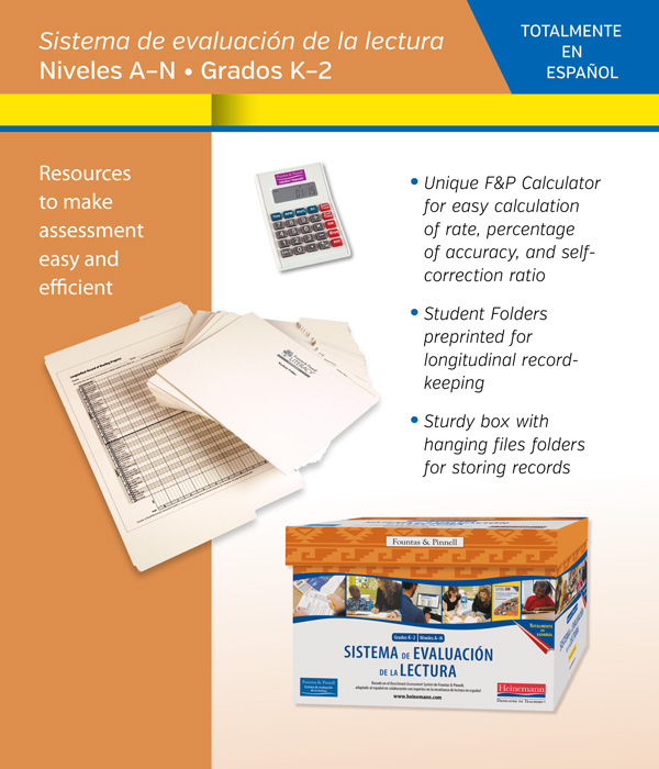From the authors of the bestselling Fountas & Pinnell Benchmark Assessment System (BAS) comes the much anticipated assessment system for Spanish-speaking students. Sistema de evaluación de la lectura, Totalmente en espanol (SEL Totalmente) is a one-on-one, comprehensive assessment to determine instructional and independent reading levels (A–N) and for placing students on the F&P Text Level Gradient™.