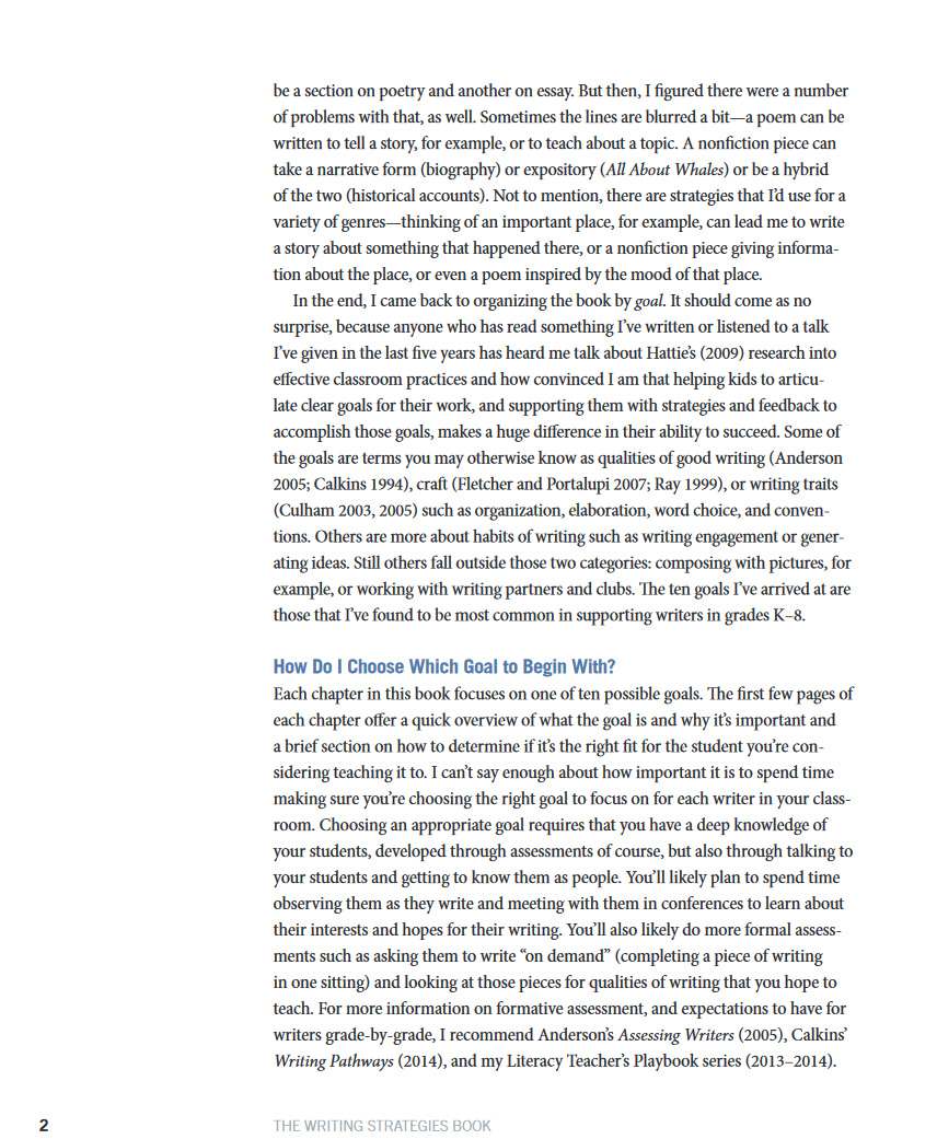 “I am convinced that helping kids to articulate clear goals for their work,” writes Jen Serravallo, “and supporting them with strategies and feedback to accomplish those goals, makes a huge difference.” With The Writing Strategies Book you can make that kind of difference with your writers every day.