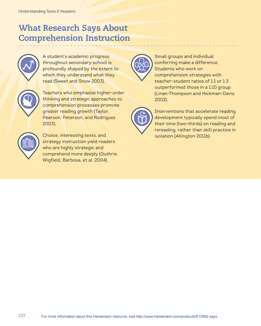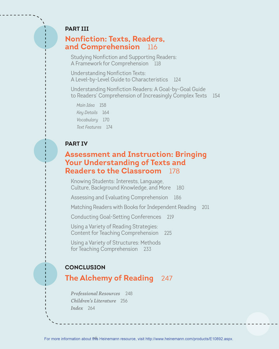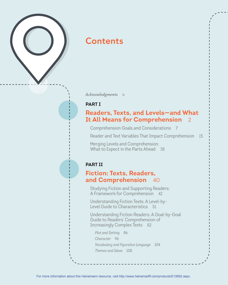 Part IV will offer advice for applying all of this knowledge of texts, readers, levels, and comprehension to the classroom: from establishing classroom libraries and matching students to books, to creating whole-book and short-passage comprehension assessments, to using the information from Parts II and III in your evaluation of student responses to reading and selection of comprehension strategies and methods of teaching.