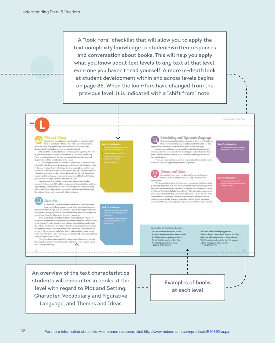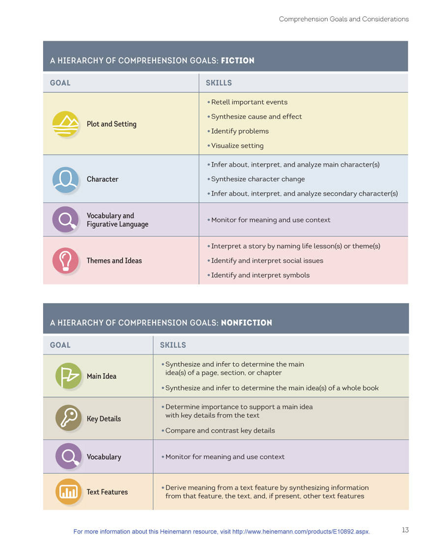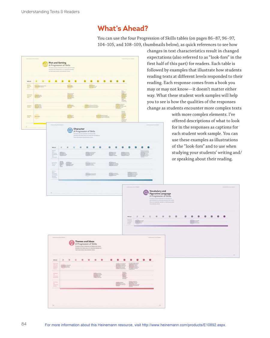 Part II focuses on fiction texts and readers, and Part III focuses on nonfiction texts and readers. In the first section of each part, I explain what I understand about text levels from my study of qualitative text leveling and from my own immersion in children’s literature, reading dozens of children’s books at each level. I use the four comprehension goals of each genre as a way to organize the discussion of texts. (See page 11 for goals.) While the first half of each part is organized by levels, the second half of each part is organized by goals (e.g., Plot and Setting) and skills (e.g., retelling important events) across the levels, to allow you to see how readers’ comprehension develops. I provide samples of student writing about reading to show what strong comprehension sounds like within each goal, as students move to increasingly challenging texts.