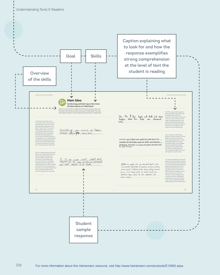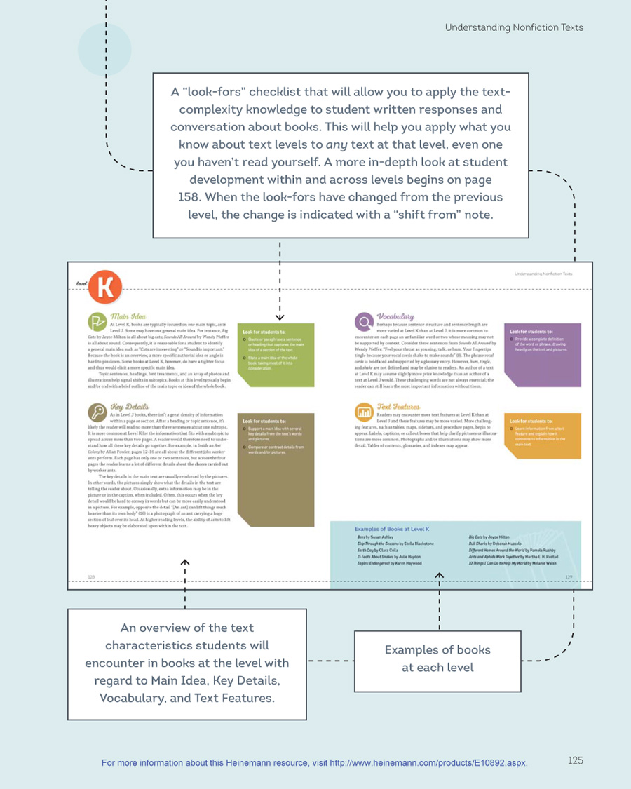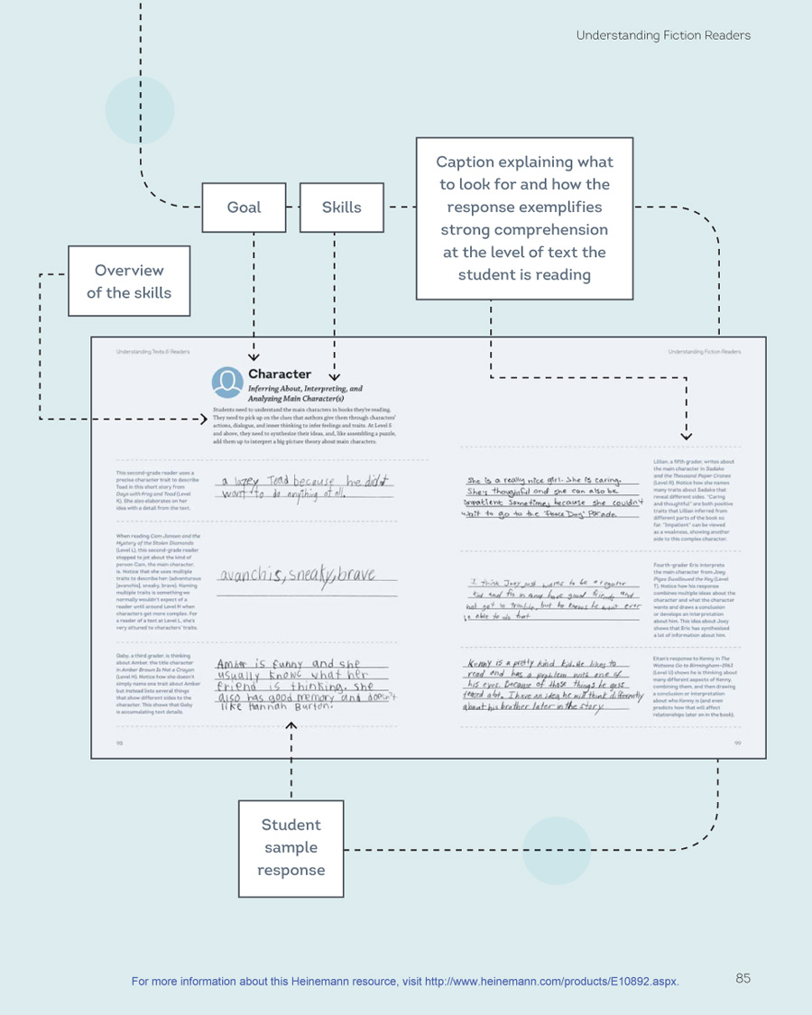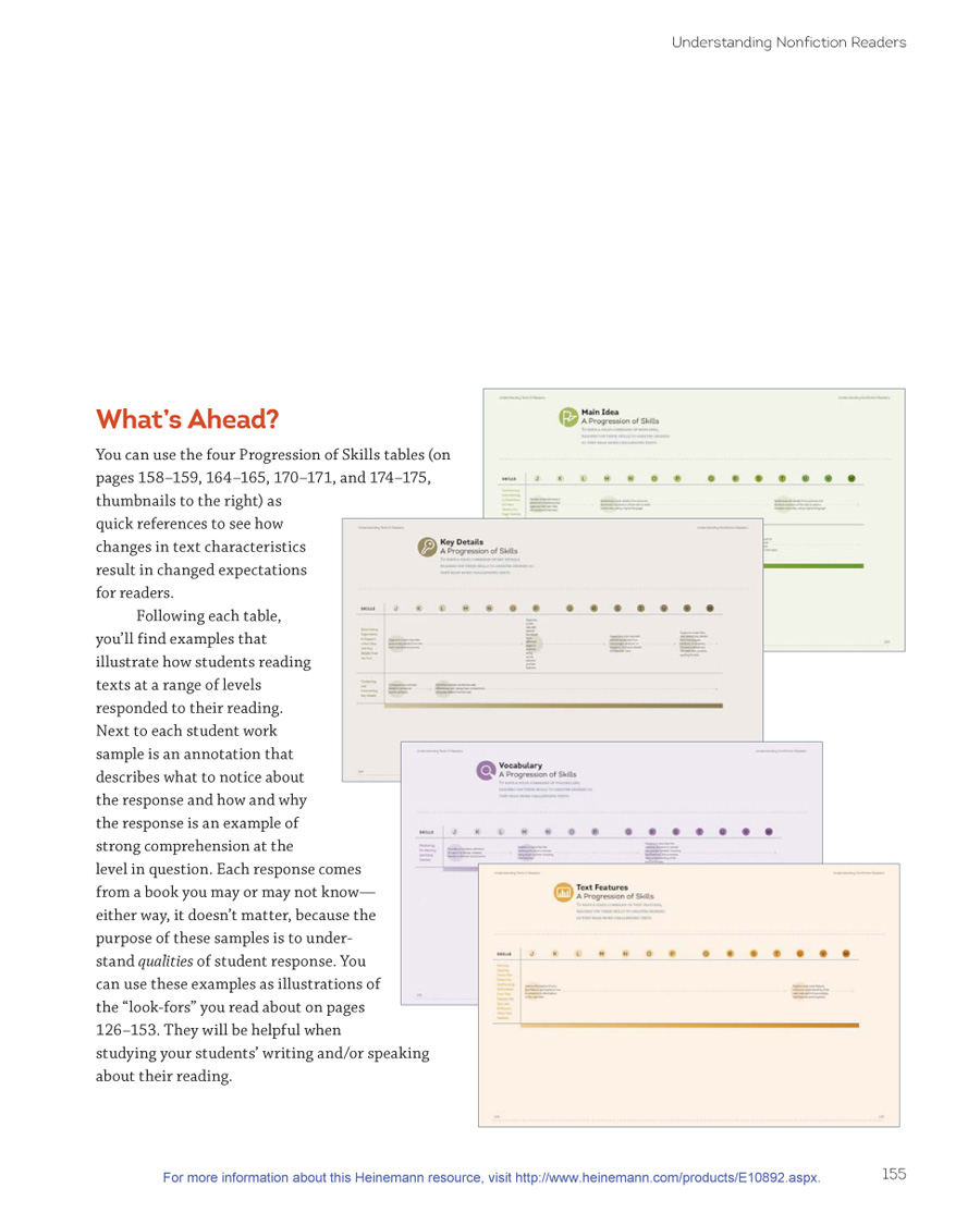 Part II focuses on fiction texts and readers, and Part III focuses on nonfiction texts and readers. In the first section of each part, I explain what I understand about text levels from my study of qualitative text leveling and from my own immersion in children’s literature, reading dozens of children’s books at each level. I use the four comprehension goals of each genre as a way to organize the discussion of texts. (See page 11 for goals.) While the first half of each part is organized by levels, the second half of each part is organized by goals (e.g., Plot and Setting) and skills (e.g., retelling important events) across the levels, to allow you to see how readers’ comprehension develops. I provide samples of student writing about reading to show what strong comprehension sounds like within each goal, as students move to increasingly challenging texts.