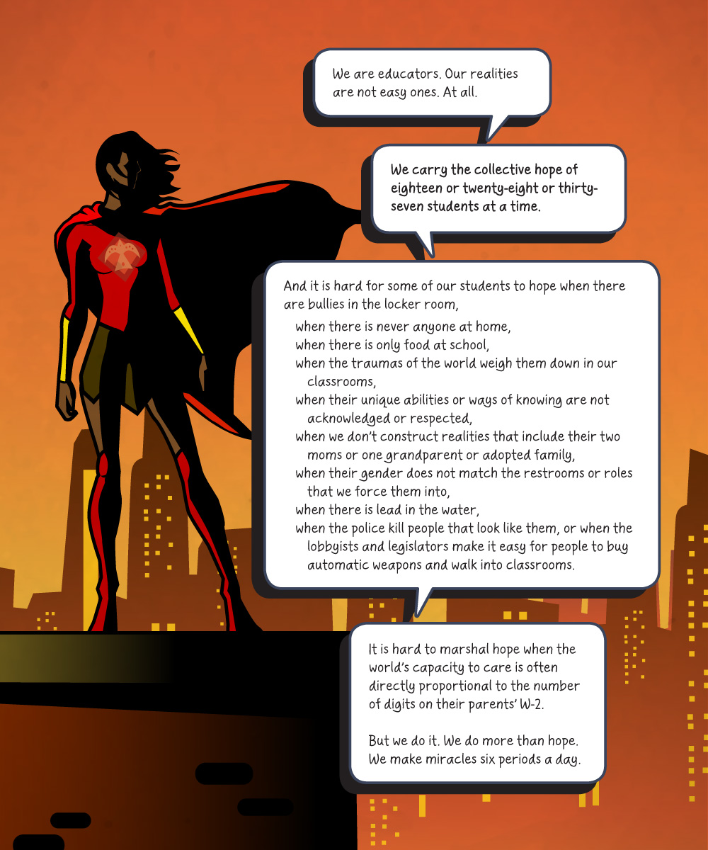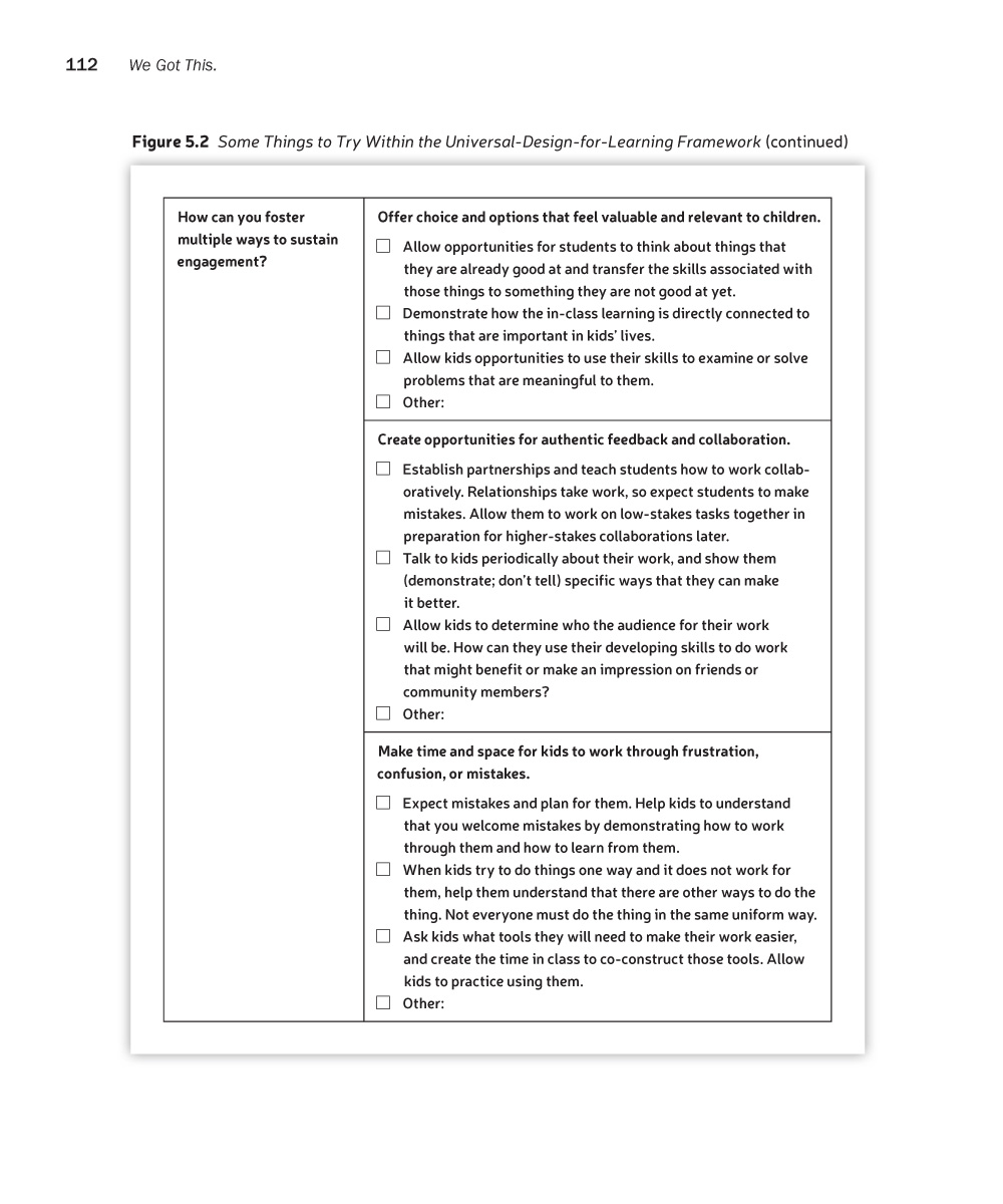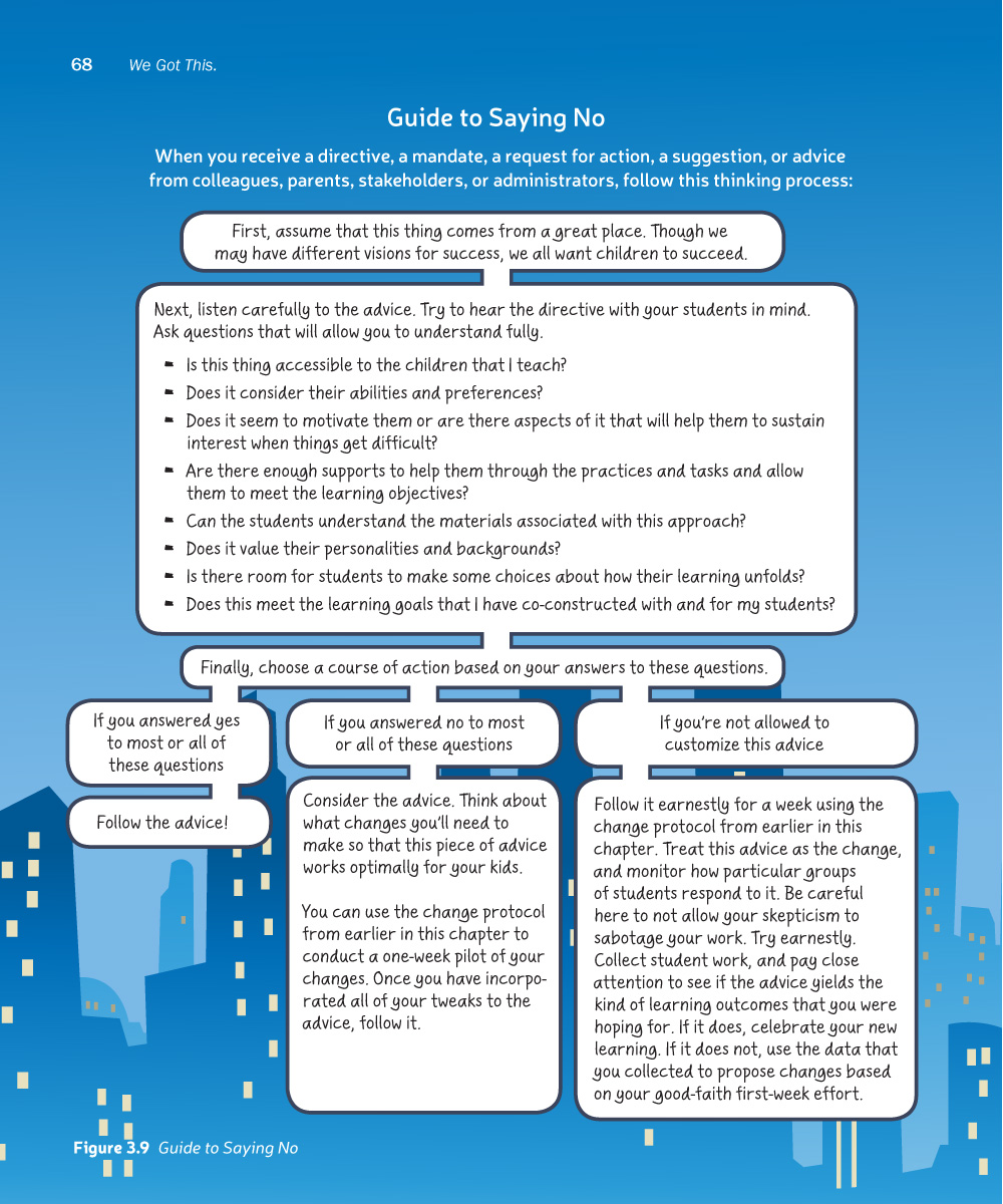 While challenging the teacher as hero trope, We Got This shows how authentically listening to kids is the closest thing to a superpower that we have. What we hear can spark action that allows us to make powerful moves toward equity by broadening access to learning for all children. A lone teacher can’t eliminate inequity, but Cornelius demonstrates that a lone teacher can confront the scholastic manifestations of racism, sexism, ableism and classism by showing: